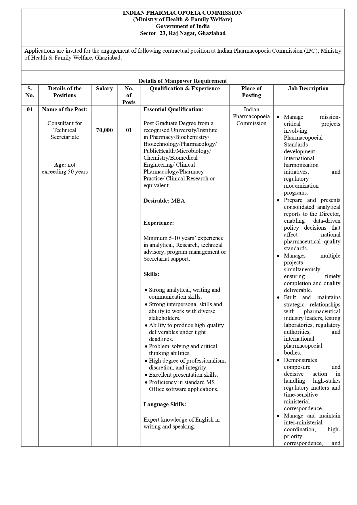 - Applications are invited for the engagement of following contractual position at Indian Pharmacopoeia Commission (IPC), Ministry of Health & Family Welfare, Ghaziabad