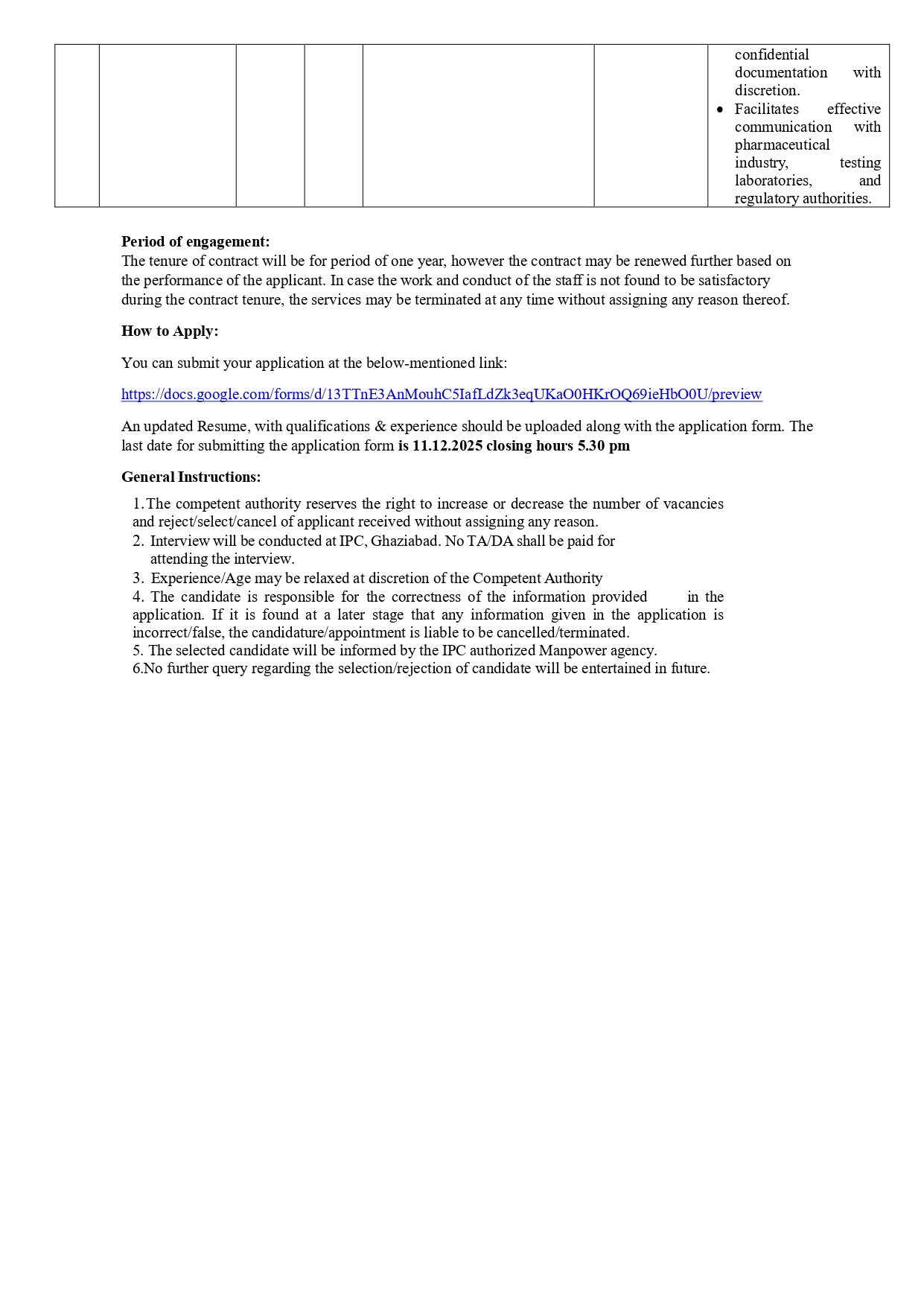 - Vacancy circular for filling up of the vacant post of Marketing Executive in Indian Pharmacopoeia Commission (IPC)