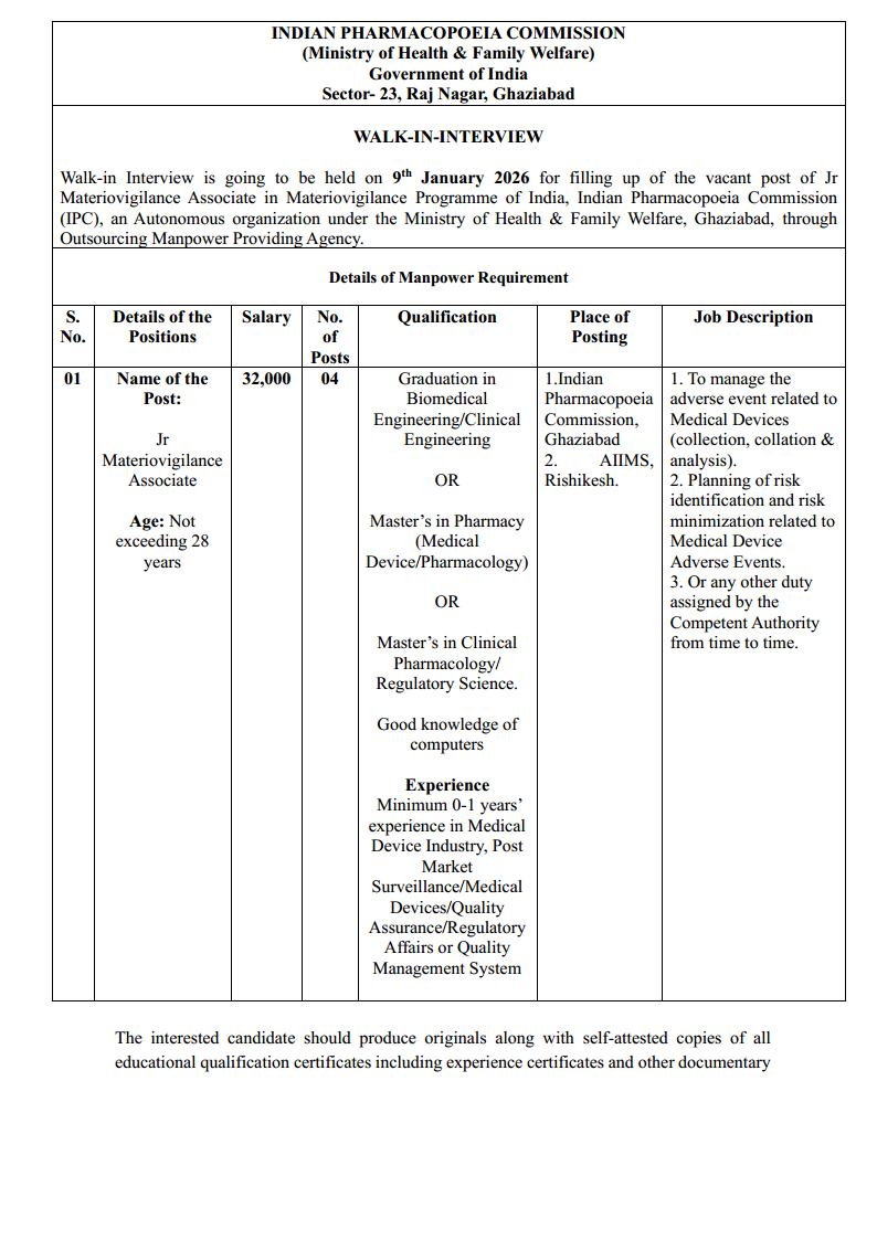 Walk-in Interview is going to be held on 9th January 2026 for filling up of the vacant post of Jr Materiovigilance Associate in Materiovigilance Programme of India, Indian Pharmacopoeia Commission (IPC), an Autonomous organization under the Ministry of He
