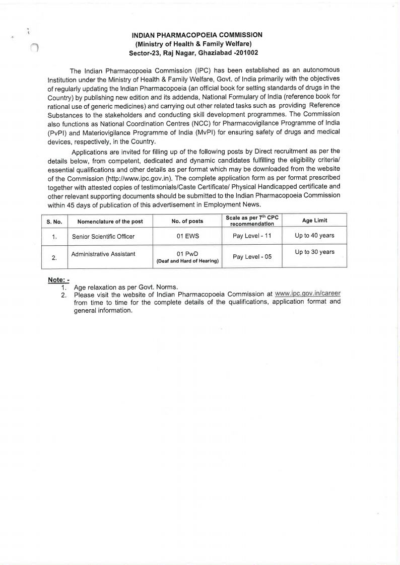 - Walk-in Interview for filling up of the vacant positions for Pharmacopoeial Associate at IPC, an Autonomous organization under the Ministry of Health & Family Welfare, Ghaziabad, through Outsourcing Manpower Providing Agency