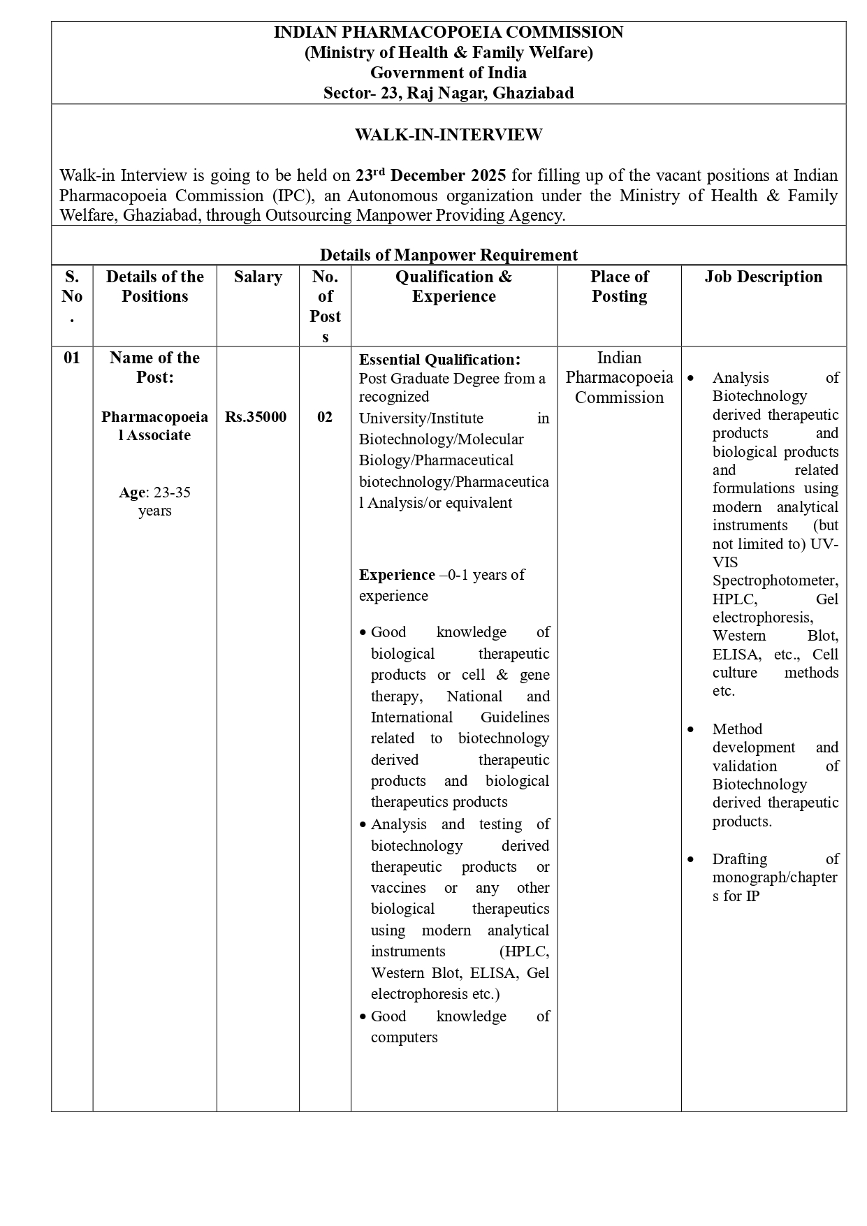 - Walk-in Interview for filling up of the vacant positions for Pharmacopoeial Associate at IPC, an Autonomous organization under the Ministry of Health & Family Welfare, Ghaziabad, through Outsourcing Manpower Providing Agency