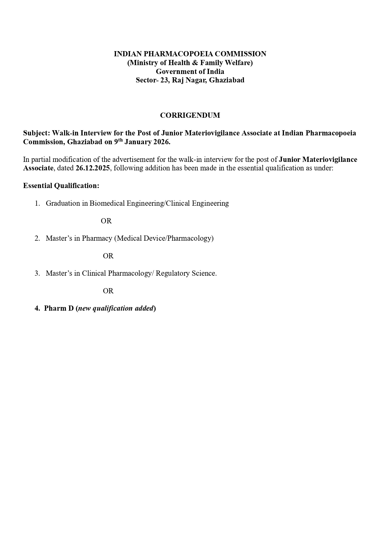 - Corrigendum regarding walk-in Interview for the Post of Junior Materiovigilance Associate at Indian Pharmacopoeia Commission, Ghaziabad on 9th January 2026