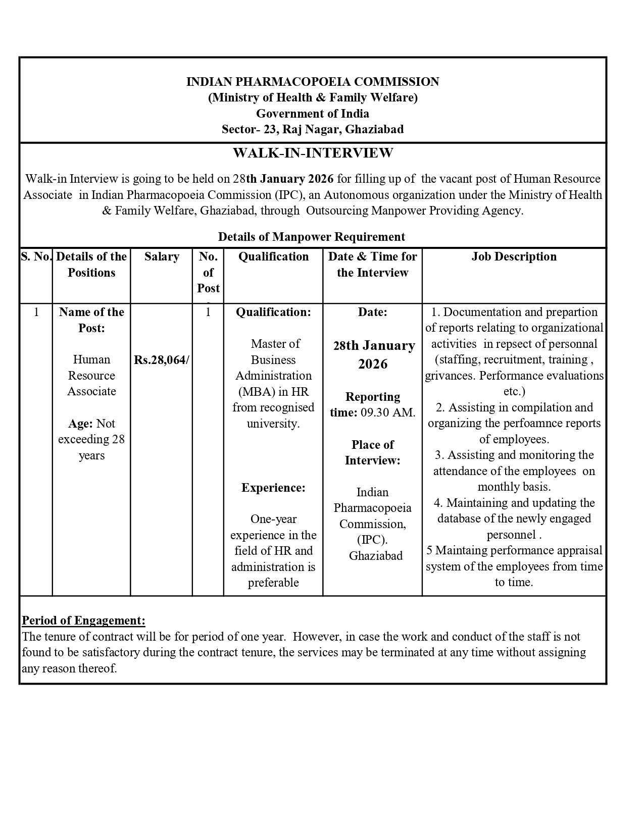 Walk-in Interview is going to be held on 28th January 2026 for filling up of the vacant post of Human Resource Associate in Indian Pharmacopoeia Commission (IPC), an Autonomous organization under the Ministry of Health & Family Welfare, Ghaziabad
