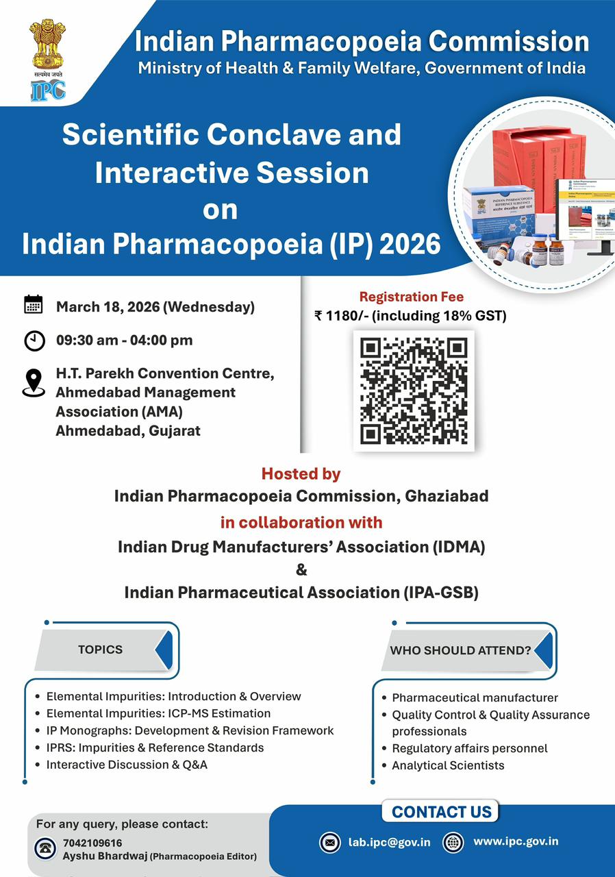 The Indian Pharmacopoeia Commission (IPC) invites registrations for the Scientific Conclave and Interactive Session on Indian Pharmacopoeia (IP) 2026.