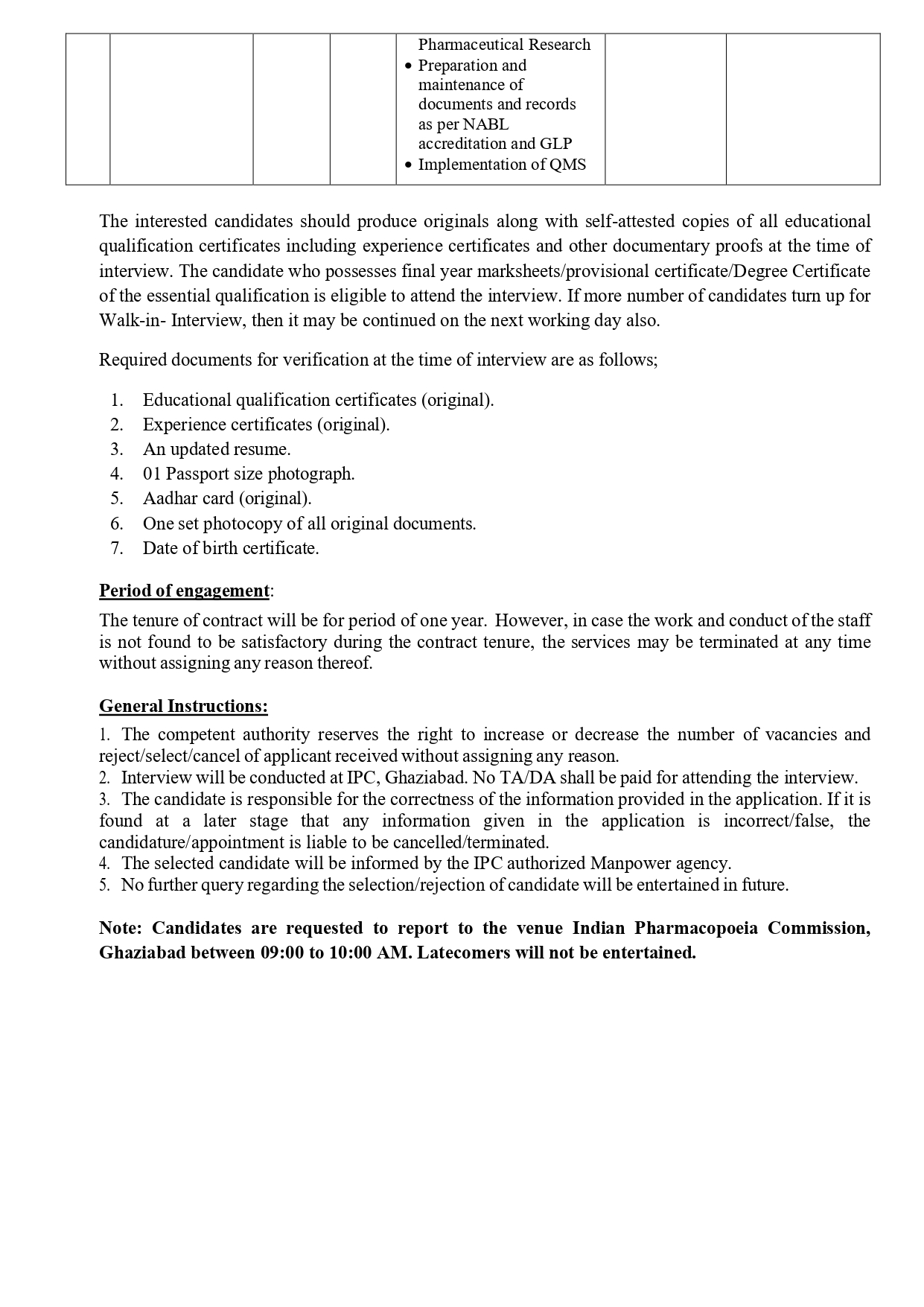 - Walk-in Interview for filling up of the vacant positions for Pharmacopoeial Associate at IPC, an Autonomous organization under the Ministry of Health & Family Welfare, Ghaziabad, through Outsourcing Manpower Providing Agency