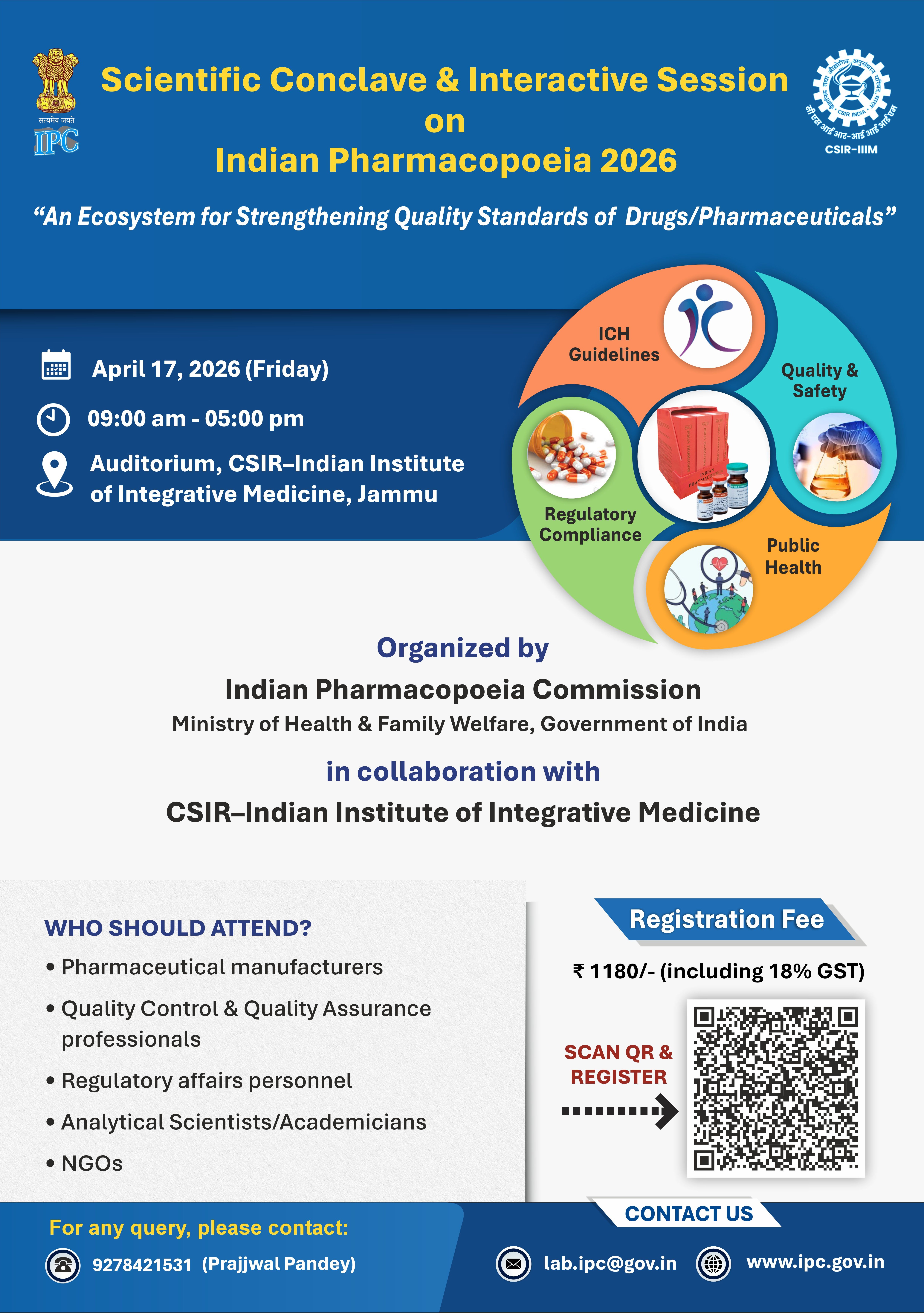 The Indian Pharmacopoeia Commission (IPC), in collaboration with CSIR-Indian Institute of Integrative Medicine (IIIM), invites registrations for the Scientific Conclave and Interactive Session on Indian Pharmacopoeia (IP) 2026.