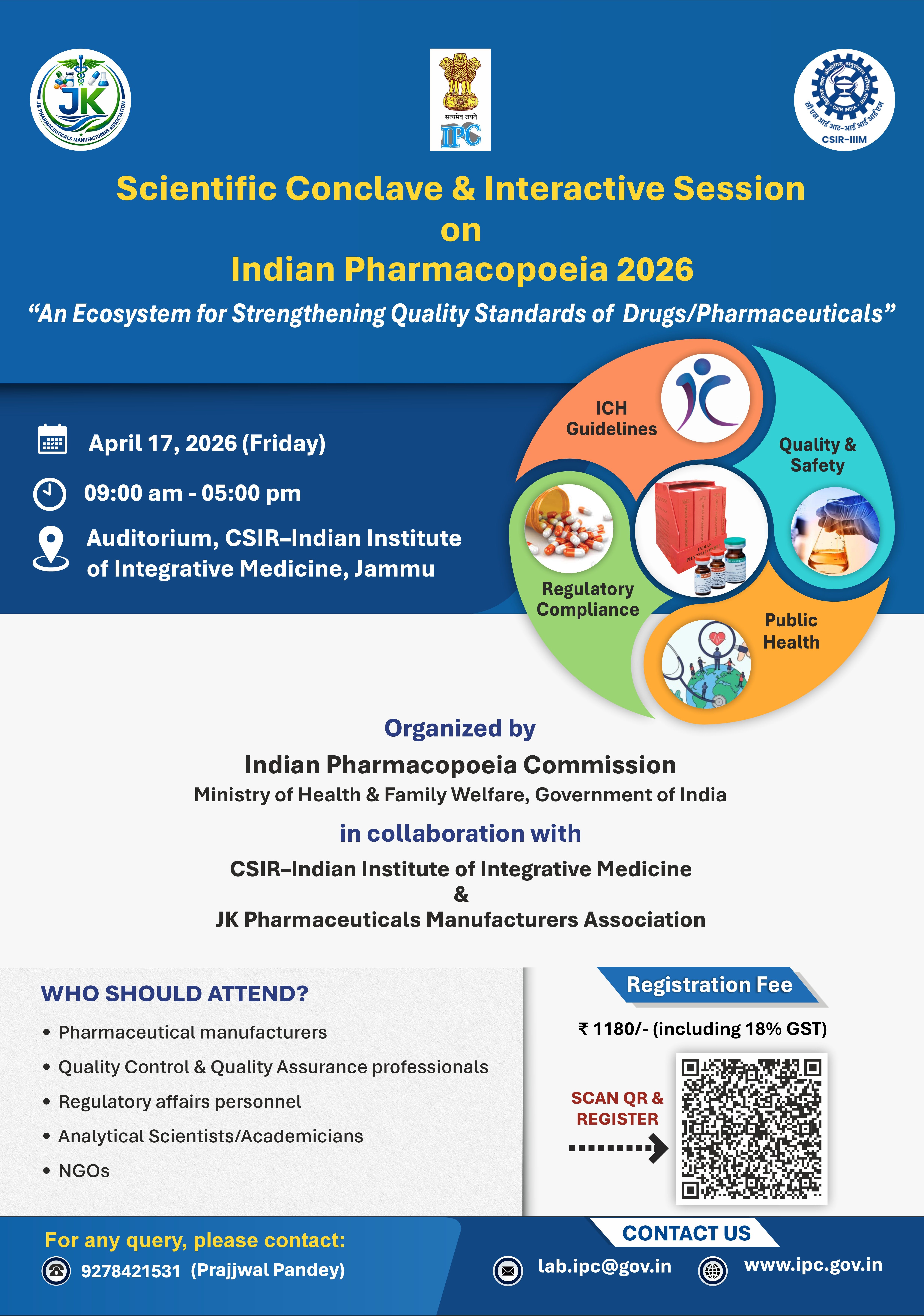 The Indian Pharmacopoeia Commission (IPC), in collaboration with CSIR-Indian Institute of Integrative Medicine (IIIM), invites registrations for the Scientific Conclave and Interactive Session on Indian Pharmacopoeia (IP) 2026.